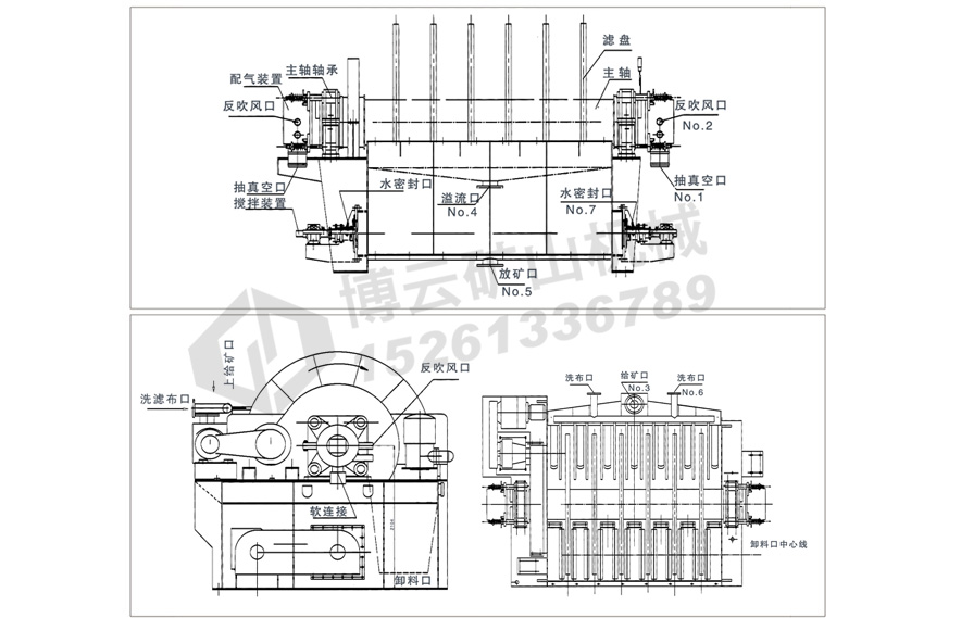 連云港博云礦山機(jī)械生產(chǎn)的PG系列盤(pán)式真空過(guò)濾機(jī) (1)扇形濾板脫水孔分布均勻,孔率合理,筋條尺寸大,由高強(qiáng)度工程塑料制成,壽命提高了2-3倍。 (2)濾液管過(guò)濾數(shù)面大,分配頭腹腔容積大,提高了抽氣率和濾液排放效果。 (3)耐磨錦綸、單或復(fù)絲濾布使脫餅率高且不易堵塞,使用壽命長(zhǎng)。 (4)多點(diǎn)干油泵集中多點(diǎn)自動(dòng)潤(rùn)滑。 (5)濾布自動(dòng)清洗裝置,保持了其良好的脫水效果。 (6)臥式強(qiáng)制高速攪拌、軸端采用橡膠及石墨盤(pán)根和水壓差三重密封不漏漿。 (7)主傳動(dòng)無(wú)級(jí)變速,依物料的濃度及流量調(diào)節(jié)(交流調(diào)速電機(jī)或變頻器),以求達(dá)到理想的工作效果 。 (8)每盤(pán)由20片扇形板組成,加強(qiáng)了過(guò)濾過(guò)程控制,成餅厚度均勻。 (9)磨擦片采用特制耐磨硼鑄鐵,剛?cè)嵯酀?jì)密封佳,使用壽命達(dá)到十年以上。 (10)濾液管為高強(qiáng)度耐磨陶瓷復(fù)合鋼管,提高壽命10倍以上。 (11)濾液管與濾扇接口去掉下法蘭,采取模具定位直接焊接,減少了90%可能的漏氣點(diǎn)。